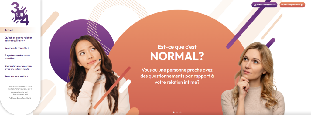 3 sur 4 s’adresse également à toutes les personnes qui s’inquiètent par rapport à une relation intime vécue par une de leur proche. https://3sur4.uqam.ca/